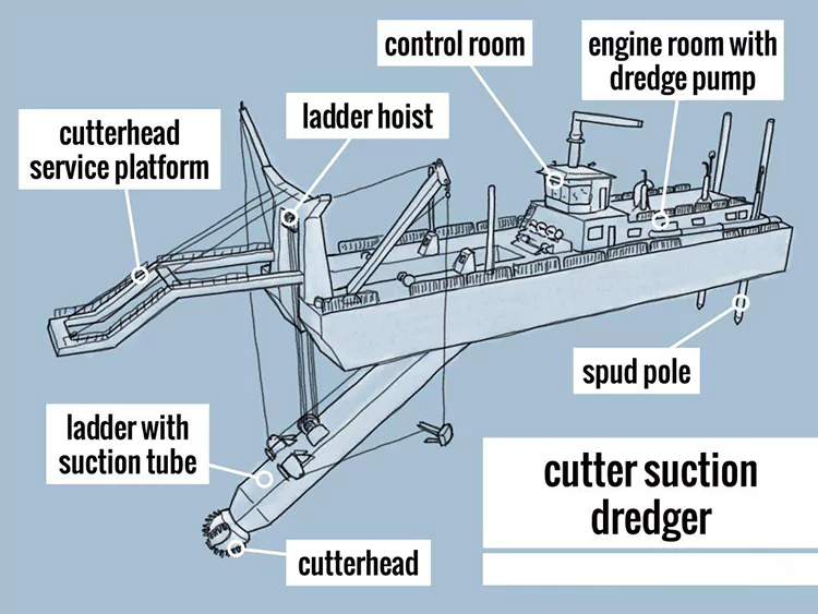 Kuttersystem: En spiralkutter er installert i frontenden, som løsner og knuser sand i elver gjennom høyhastighetsrotasjon, og er egnet for ulike jordtyper som sand, leire og stein.